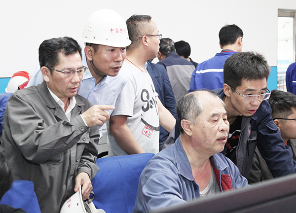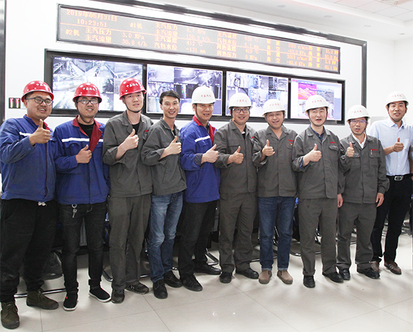 4萬機組一次并網(wǎng)成功后,集團總工程師李成玉(右三)、項目建設部長胡林桂(右一)中鑫熱電總經理韋毅民(右二)和副總經理李樹彬(右四)同部分生產、技術管理骨干在中控室露出歡快的笑容!